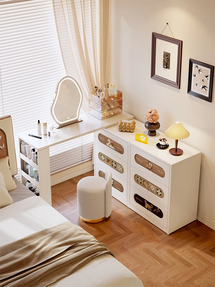 フレンチクリーム風化粧台&タンス一体型モダンシンプルホワイト天然木製ドレッサー - ベッドサイドにぴったりの洗練されたデザインで、毎日のメイクアップをもっと楽しく!