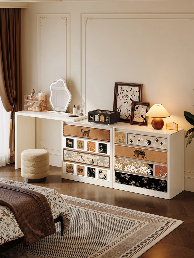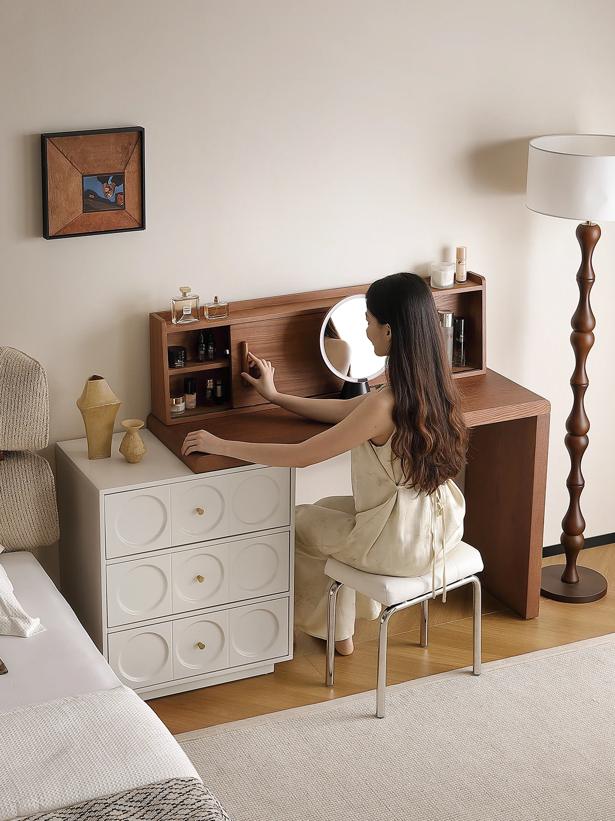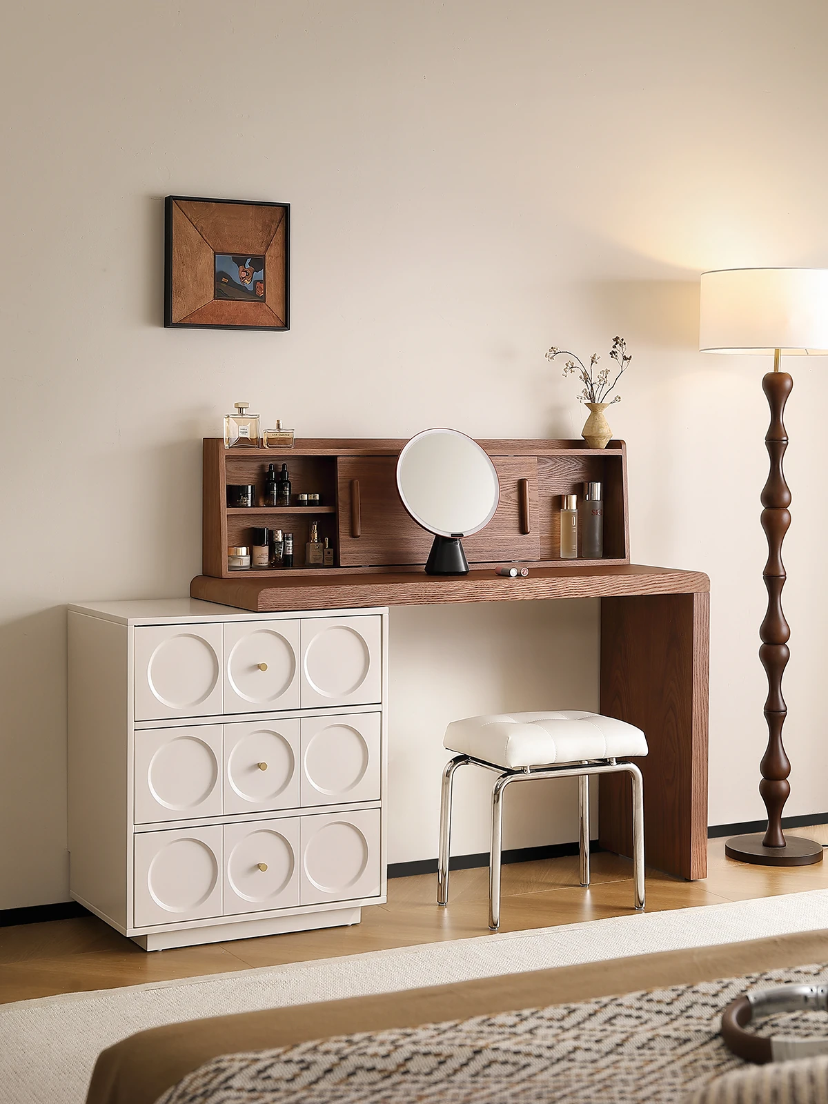 Wabi-Sabi Style Makeup Vanity and Nightstand Combo - Vintage Minimalist White Cream Makeup Storage Dresser for a Chic and Cozy Bedroom